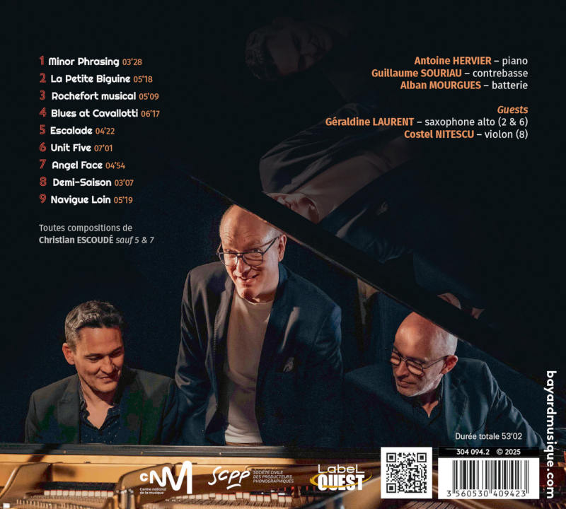 À travers des arrangements sensibles et une interprétation habitée, Antoine Hervier fait résonner l’héritage de son mentor tout en affirmant sa propre voix, notamment avec Escalade, composition inédite du pianiste en forme de dernier salut au maître. « Navigue loin » – du titre d’une composition d’Escoudé – devient ici un mot d’ordre : celui d’une musique qui trace son chemin entre fidélité et invention, mémoire et modernité.